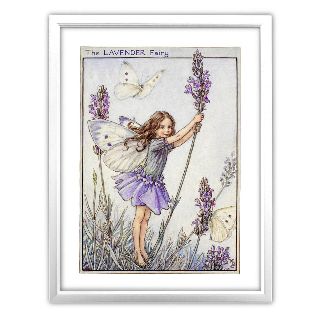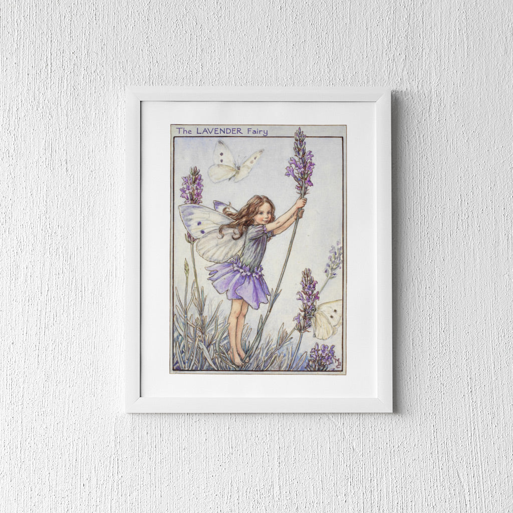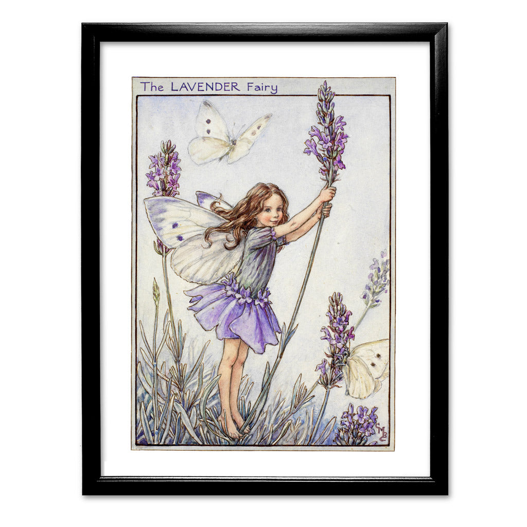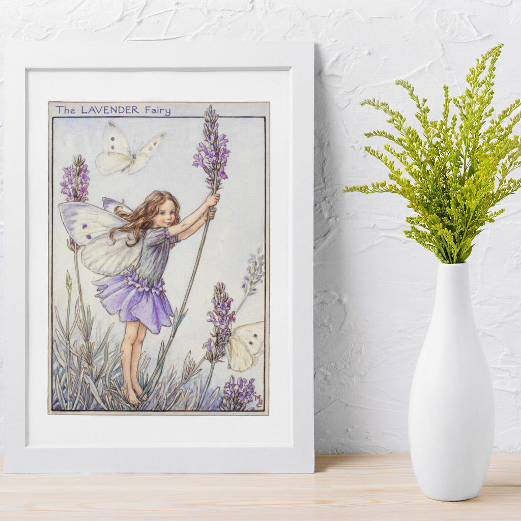 The Lavender Fairy Art Print is available in different framed options, complete with either black or white frames, a strut back, and a hook with a glass front.